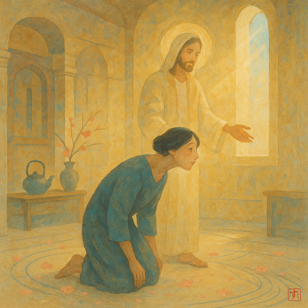 Imagina llevar dieciocho años encorvado, viendo solo el suelo, tu propio ombligo. Eso le pasaba a esta mujer del Evangelio. Su mundo se había reducido a lo que podía ver a sus pies. Me recuerda al concepto japonés de ‘shūchū’ – esa concentración intensa pero a veces limitada que nos hace enfocarnos solo en nuestros problemas.